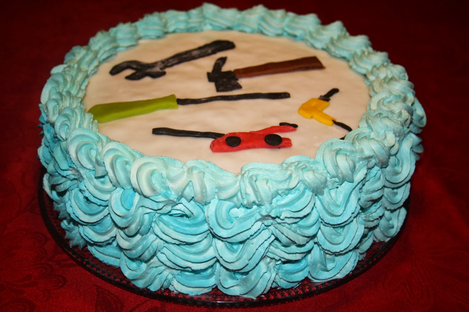 Tässä poikamme synttärikakku 2 hänen toiveidensa mukaan koristeltuna. Kakun täytteenä on mansikkahilloa ja suklaamoussea Geisha-suklaasta (5 dl kermaa + 200 g Geisha-suklaata). Kakun päällä on valkoista sokerimassaa ja reunoilla siniseksi värjättyä kermavaahtoa. Sokerikakkupohjan tein seitsemästä kanamunasta ja kakkulevyt kostutin vaniljasokerilla maustetulla maidolla.